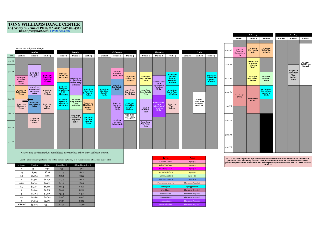 Dancers in Int. Ballet 1 and beyond are required to take their additional class supplement each year. Those classes include: Conditioning, Modern, Lyrical, Variations, etc depending on the year and those classes are purposely scheduled around your child’s ballet classes. If you have any questions please contact the TWDC office at twdcinfo@gmail.com for the appropriate class for your child. you’ve checked the Ballet Syllabus on another page of this website.