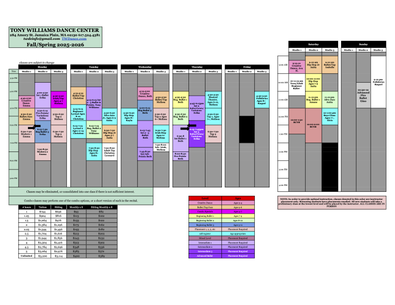 La cuota de inscripción es de $35 por familia. Salvo solicitud, el pago de la matrícula se realizará mensualmente en 8 pagos. Los pagos de la matrícula vencen y se procesan automáticamente a la tarjeta de crédito/débito asociada a su cuenta de Studio Pro el primer sábado de cada mes, de septiembre a mayo (excepto diciembre). Consulte la tabla a continuación para ver los montos mensuales de la matrícula. La cuota de $85 para el vestuario del recital vence el 6 de diciembre y no es reembolsable. Si paga después del 6 de diciembre, es probable que su hijo/a no pueda recibir un vestuario ni participar en el recital. La cuota de $85 para el vestuario no cubre ningún otro costo asociado con el recital, como entradas, accesorios, etc. Las entradas para el recital estarán disponibles para su compra en abril. Si tiene preguntas sobre matrícula por favor envíe un correo electronico twdcinfo@gmail.com.